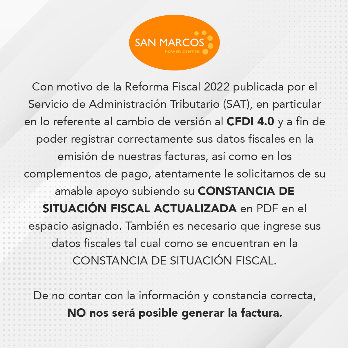 Con motivo de la Reforma Fiscal 2022 publicada por el Servicio de Administración Tributario (SAT), en particular en lo referente al cambio de versión al CFDI 4.0 y a fin de poder registrar correctamente sus datos fiscales en la emisión de nuestras facturas, así como en los complementos de pago, atentamente le solicitamos de su amable apoyo subiendo su CONSTANCIA DE SITUACIÓN FISCAL ACTUALIZADA en PDF en el espacio asignado. También es necesario que ingrese sus datos fiscales tal cual como se encuentran en la CONSTANCIA DE SITUACIÓN FISCAL. De no contar con la información y constancia correcta, no nos será posible generar la factura.